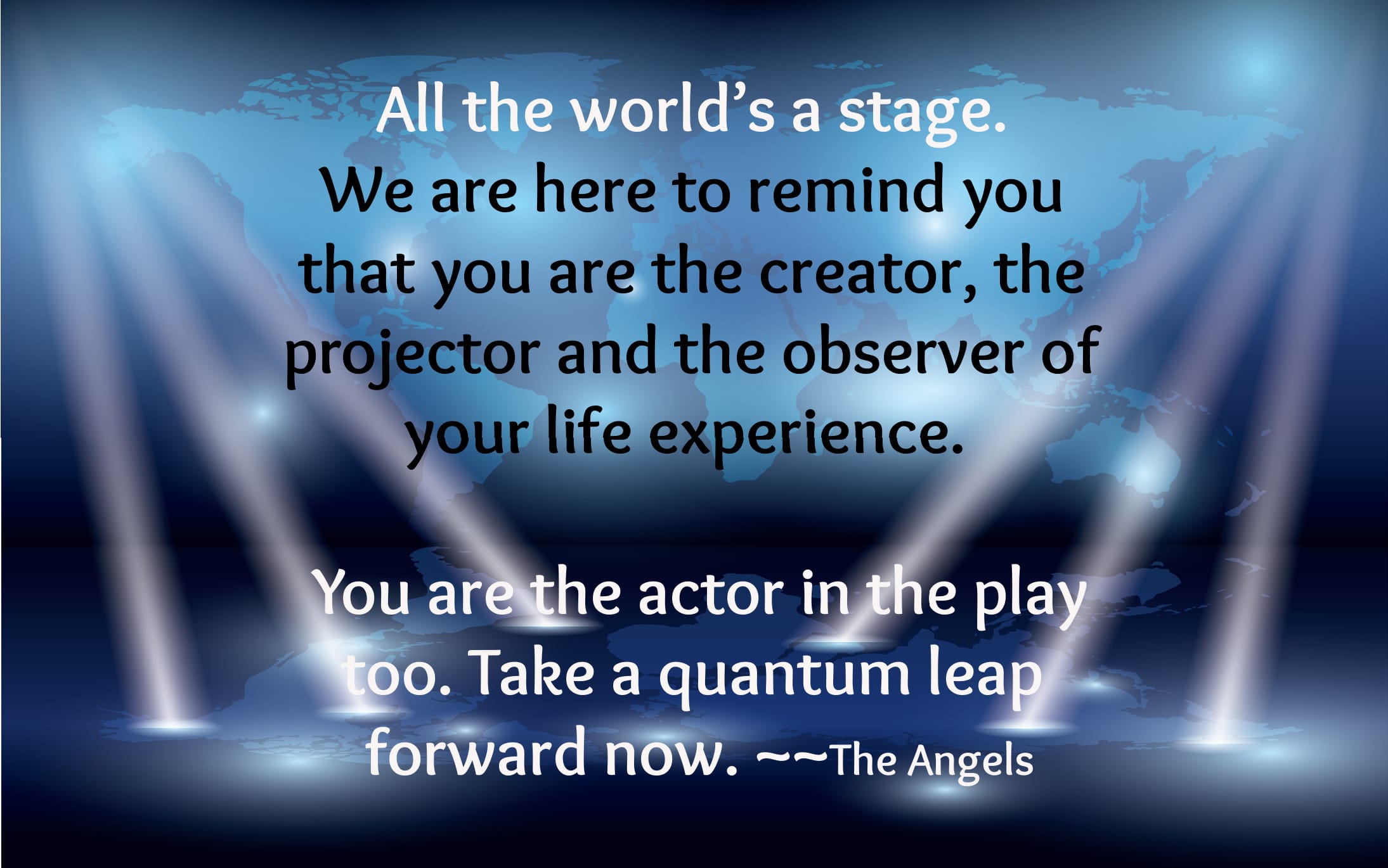 All the world’s a stage. The quote says, “…all the men and women merely players; They have their exits and their entrances; And one man in his time plays many parts.”* William Shakespeare