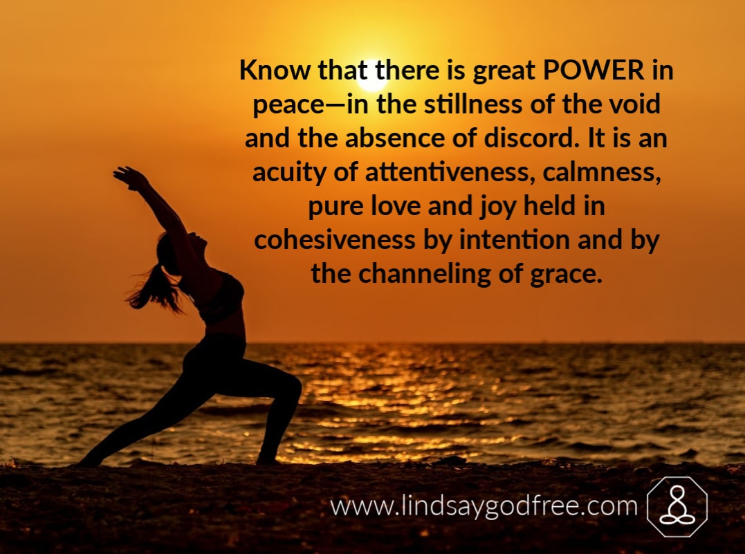 Know that there is great POWER in peace—in the stillness of the void and the absence of discord. Peace is not a wimpy powerlessness but an aliveness of harmony and balance. It is an acuity of attentiveness, calmness, pure love and joy held in cohesiveness by intention and by the channeling of grace.